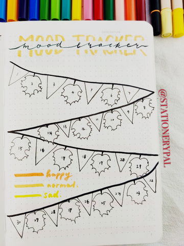 The mood tracker is also designed with maple leaves and three colors. For the title, first cut out a thin strip of paper, let the paper cover part of the words, and write black words on the vacant part with a brush pen.