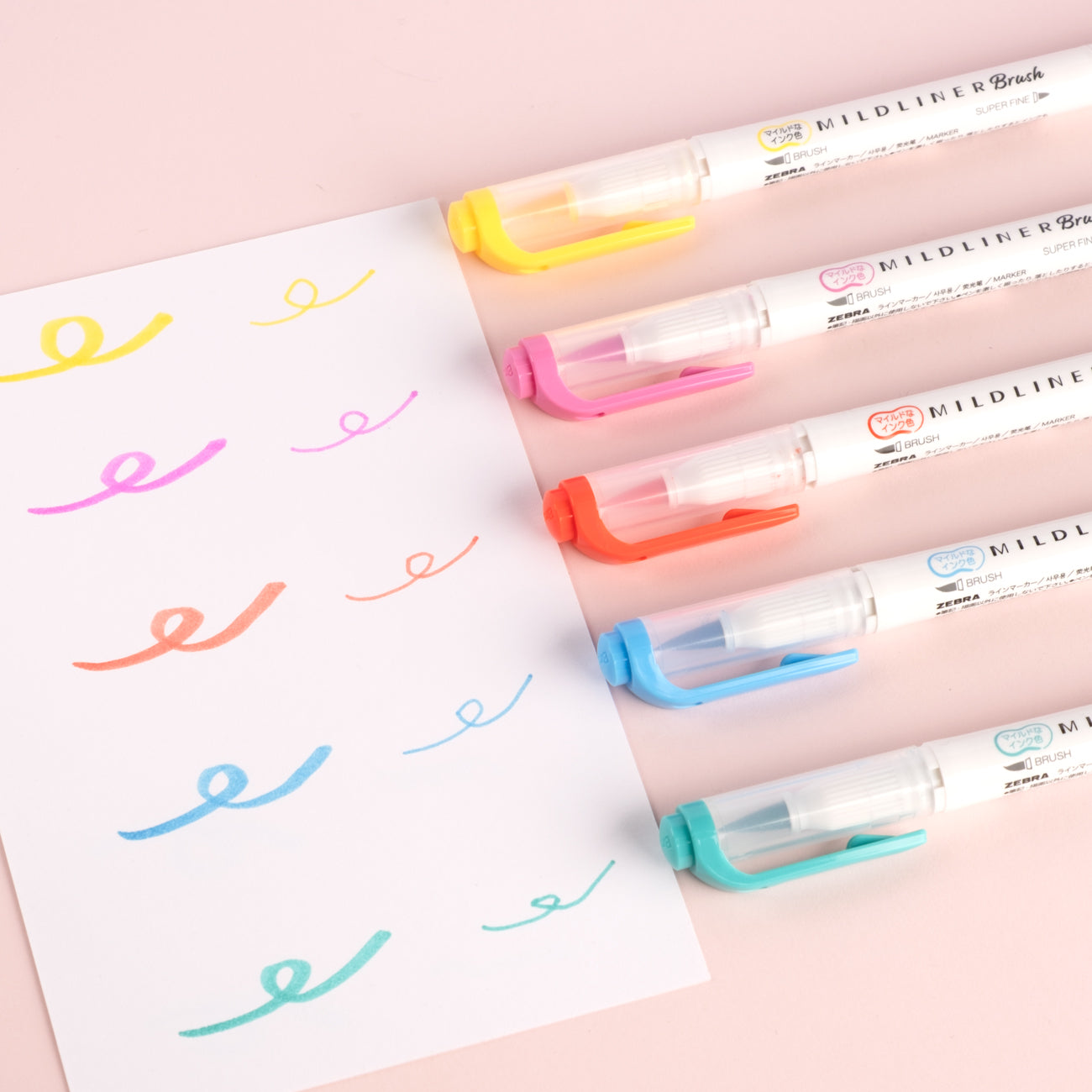 Introducing The Zebra Mildliner Brush Pen! This new product combines the colors and features of the Mildliner Creative Tool with the unlimited possibilities of a brush pen. The Zebra Mildliner Brush Pen is conveniently double-ended with a paintbrush-like tip and fine marker. It features the soft, mild Mildliner ink that you love that is translucent, excellent for layering and doesn’t bleed through. The brush tip is like an artist’s brush, allowing for thick or thin strokes while the fine tip marker provides more consistent lines.